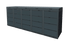 Eine hohe, rechteckige Mülltonnen Box aus dunklem Metall mit glatten Seitenpaneelen und einem flachen, aufklappbaren Deckel.